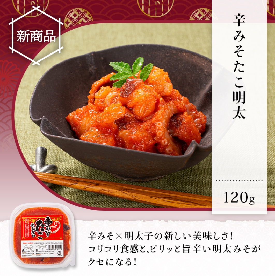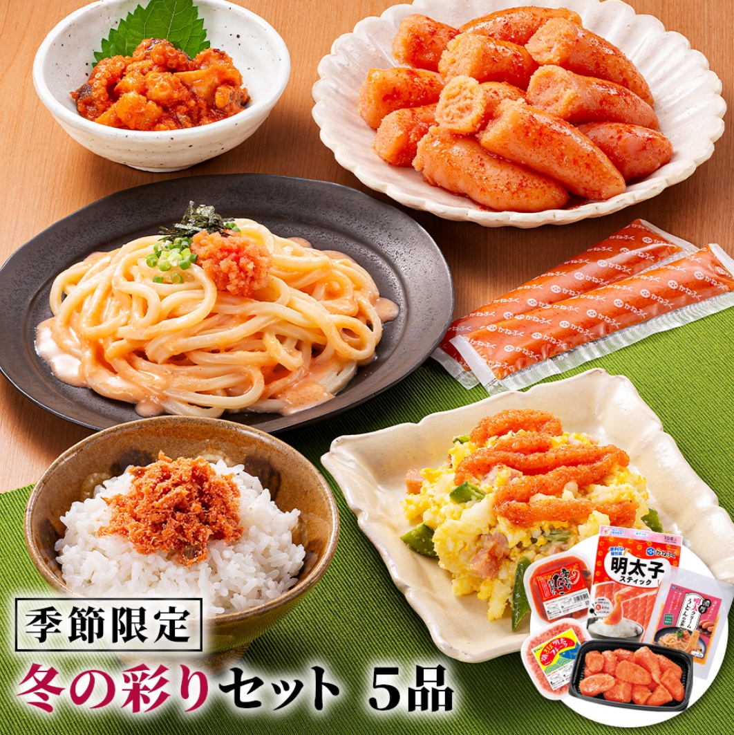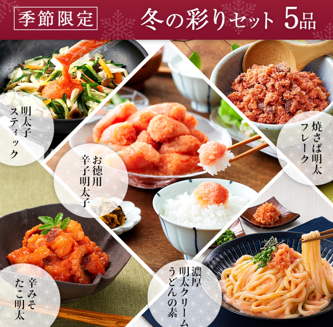 無着⾊⼿みやげ明太⼦ 270g/明太⼦がたっぷり⼊った⾷べるラー油 110g/明太からし⾼菜 230g/明太⼦⼊りあらびきソーセージ 6本