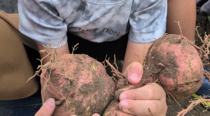 一緒に力を合わせて土を掘り進めると、ついに大きなサツマイモが姿を現しました!